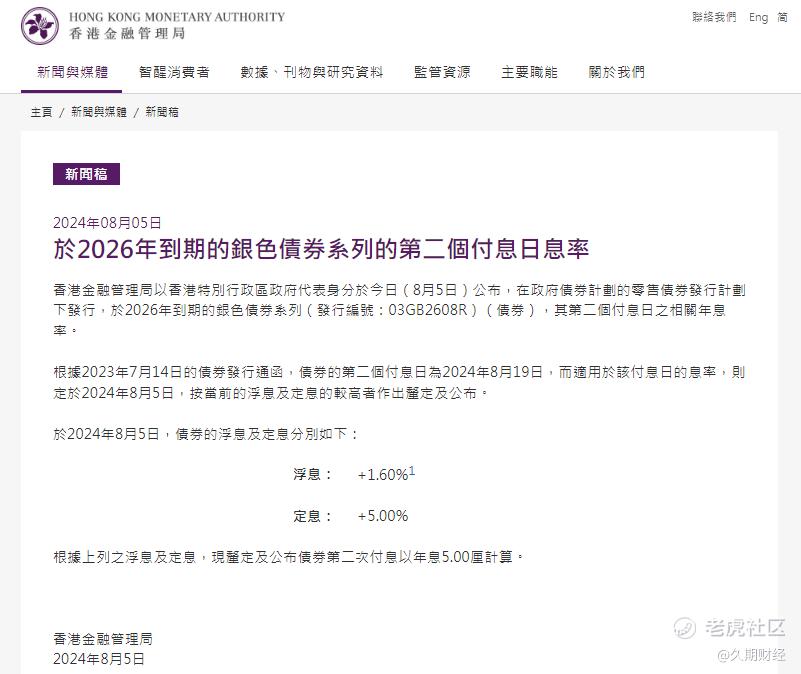 久期财经讯,8月5日,香港金融管理局以香港特别行政区政府代表身分于8月5日公布,在政府债券计划的零售债券发行计划下发行,于2026年到期的银色债券系列(发行编号:03GB2608R)(债券),其第二个付息日之相关年息率。