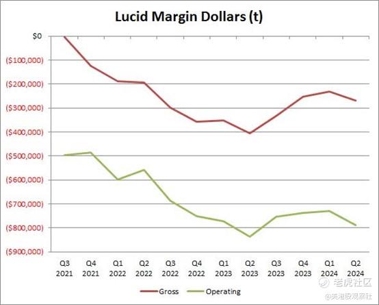 Lucid上个月宣布,第二季度交付了近2400辆汽车,创下了季度记录。这意味着该季度的收入略高于2亿美元,但每辆车的交付收入继续下降,环比下降约4,000美元,同比下降近24,000美元。该公司确实超出了市场预期约800万美元,尽管其中至少有一个预期相当低(可能相当过时),这有助于将平均水平降低一点。