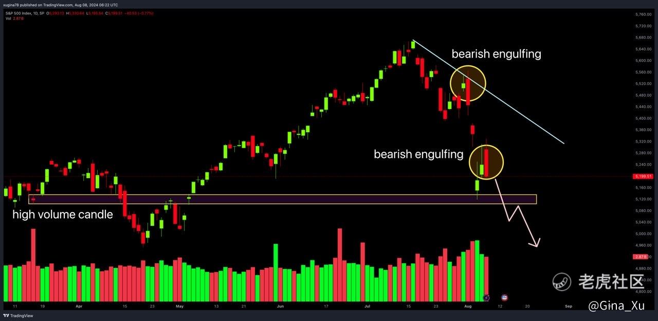 标普500图表上来看,价格整体目前已经在走下降趋势,跌到前期高点同时也是前期放量关键K线区域后出现反弹。但昨日收出了一根穿头破脚的大阴线,而前面反弹高点出现穿头破脚看跌形态后股价就开始继续下跌了。因此,接下来大概率可能还是会以继续下跌为主,现在持有股票做多的朋友,还是注意风险哦!