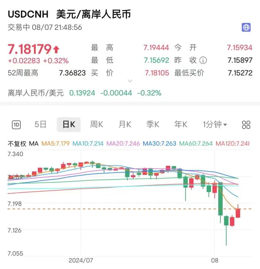 事实上,8月2月美国非农就业数据一出,美联储降息预期升温,周一人民币汇率短时间从7.25飙升到7.09,市场情绪冷却后今天再次下跌到7.18。