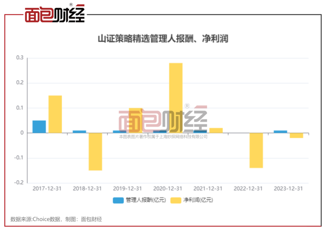Choice数据显示,2023年山证策略精选亏超153.66万元。2024年二季度,该基金浮亏26.9万元,上半年合计浮亏超420万元。