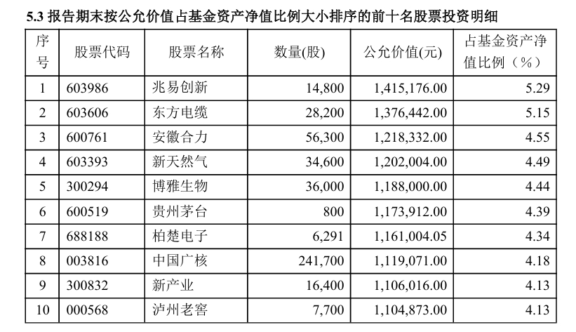 2024年二季度末,基金重仓股包括兆易创新、东方电缆、安徽合力等企业。截至2024年8月6日收盘,柏楚电子、安徽合力等新重仓股自三季度以来股价表现较弱,跌幅均超过20%。