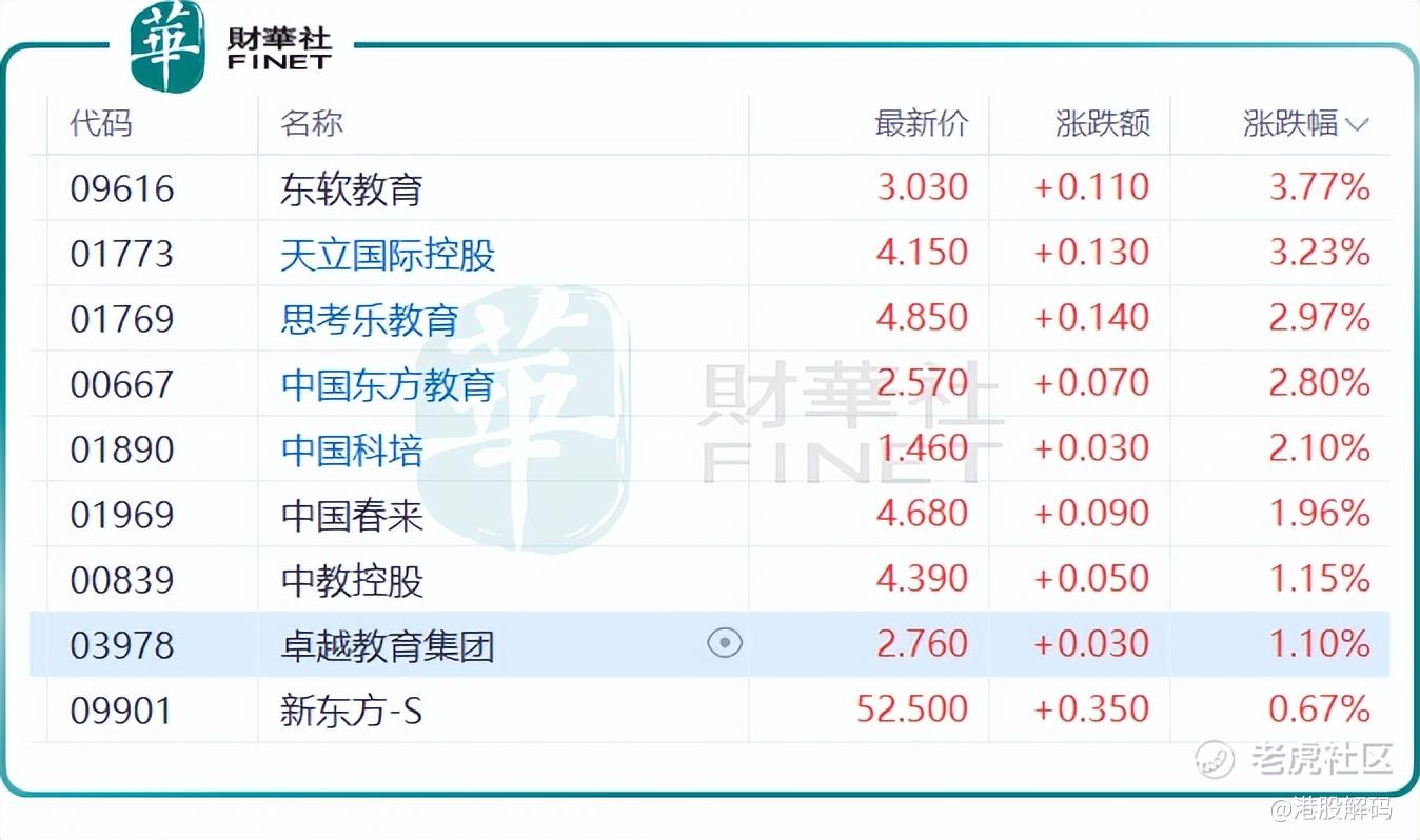截至收盘,港股 $东软教育(09616)$ 、 $天立国际控股(01773)$ 、 $思考乐教育(01769)$ 、 $中国东方教育(00667)$ 等教育股涨幅均超2%, $卓越教育集团(03978)$ 、中教控股、新东方等跟涨。其中,卓越教育集团早盘一度大涨9.15%,领涨整个板块,只不过午后股价有所走弱。