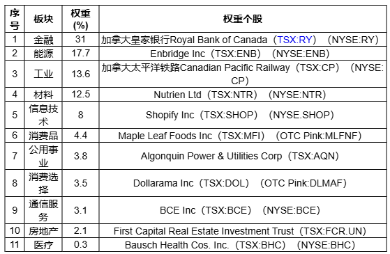 S&P/TSX 综合指数涵盖11个行业类别:金融、能源、材料、工业、可选消费、电信服务、医疗保健、必选消费、公用事业、信息技术和房地产。金融和能源行业的指数成分股最多,其次是工业和材料,因此这些行业表现的好坏或油价的波动对指数影响较大。