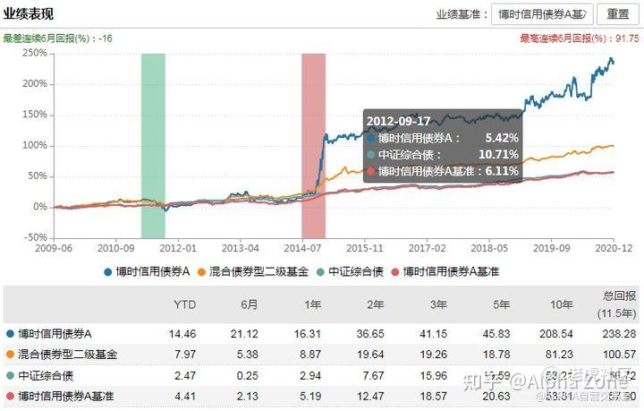 这里的博时信用债A是我的样本里过去十年里年化最高的债券,大家可以看到这里的走势有涨有跌,一般来说买债券类基金的都是要长期持有的。虽然总体来讲长期是赚钱的,但是在这个净值图里,大家也可以看到实际上也是有很大波动的。