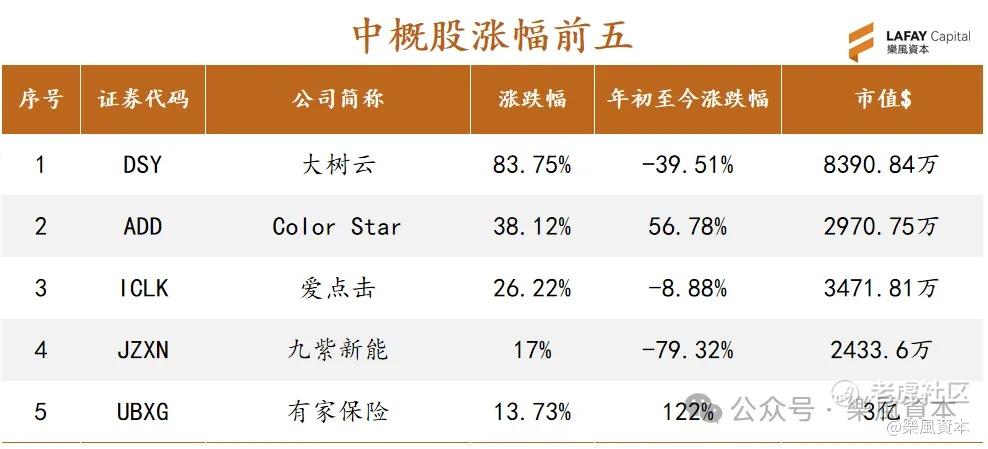 中概股涨幅排名前三的是大树云、Color Star、爱点击,涨幅分别为83.75%、38.12%、26.22%。