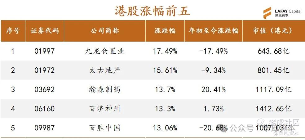 上周,港股周涨幅排名前三的是九龙仓置业、太古地产、瀚森制药,涨幅分别为17.49%、15.61%、13.7%。