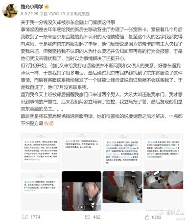 近日,微博ID为“路允小同学”的网友称,自己一分钱没欠却被京东金融上门催债。据该网友描述,其在去年年底办理了一张宽带卡,随即该号码就收到了京东金融的催债短信,在女子申诉后,京东金融客服表示是因为宽带卡的前主人欠钱所致。