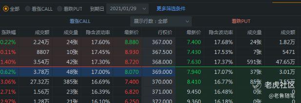 很多人说QQQ大盘个股成分太单一,我这里就用spy给大家讲解一下,当前时间为2020年12月27日,spy价格为369美元,我们看下它的期权连,2021年1月29日到期 ,行权价369美元的put期权价格为7.94,call期权价格为8.07