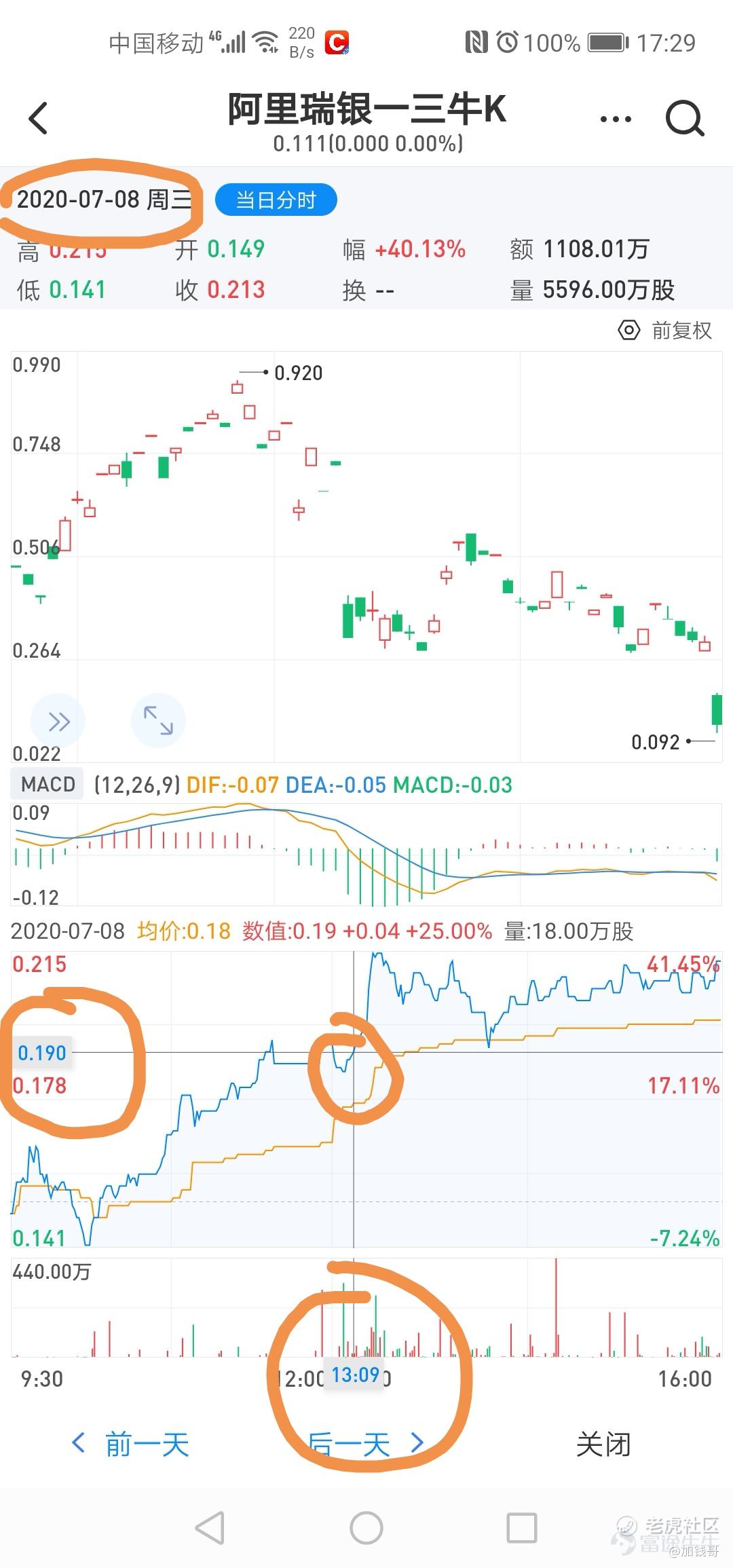 2020年7月8日13:06,我买的一只阿里牛证52902,突然涨了很多,如图所示,中间大圈这段时间斜率突然增大,不断上涨,而此时正股阿里巴巴并没有上涨,该牛证溢价有明显上升。(市场行为不用去深入思考原因)