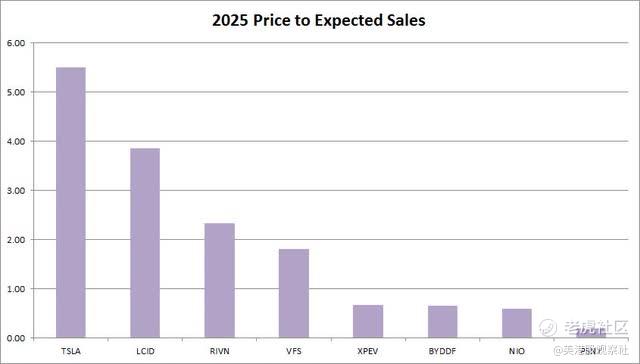 目前,特斯拉的交易价格是其2025年预期销售额的5.5倍,但其他所有电动车玩家的交易价格都不到四倍。正如下面的图表所示,Rivian现在的交易价格低于Lucid的估值,但高于VinFast,这两家公司都比Rivian的状况要好。中国玩家如蔚来、比亚迪和小鹏汽车目前的交易价格要低得多,而Polestar 的交易价格就像它即将破产一样。传统的美国汽车制造商的交易价格不到其2025年预期销售额的0.3倍,这意味着Rivian的交易价格大约是这个数字的9倍。
