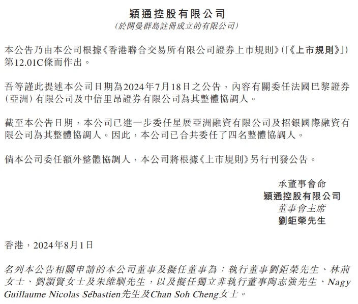 2024年8月1日,来自香港的香水品牌管理公司颖通控股有限公司 Eternal Beauty Holdings Limited(下称"颖通控股”)公告,进一步委任星展亚洲融资有限公司及招银国际融资有限公司为其整体协调人。