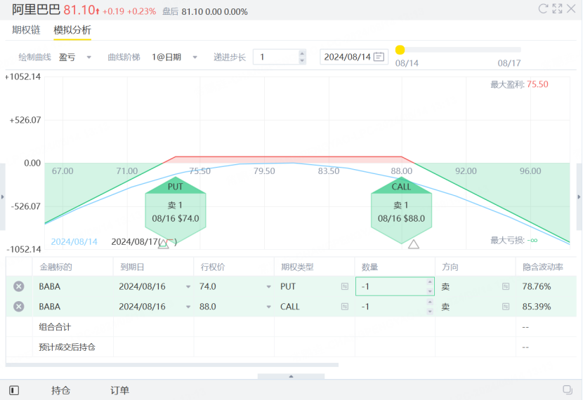财报公布后,阿里巴巴的收盘价必须在73.25(74-0.75)美元到88.75(88+0.75)美元之间(不包括佣金),才能获得利润,最大利润为75美金。如果阿里巴巴财报后股价大幅度低于73.25,或者高于到88.75,那么投资者可能会产生比较大的亏损,并且理论上因为阿里巴巴的涨跌幅会无限大,所以这个亏损也可能是无限大的。