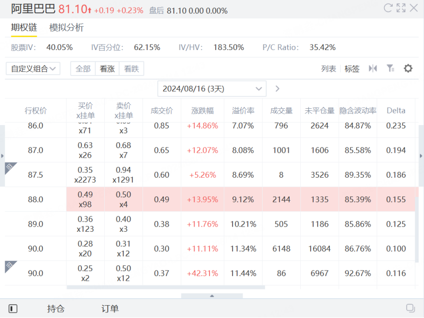 当前股票阿里巴巴目前交易价格为81.1美元。投资者可以通过以下操作实施空头宽跨式策略: