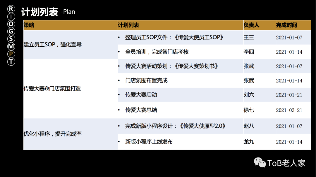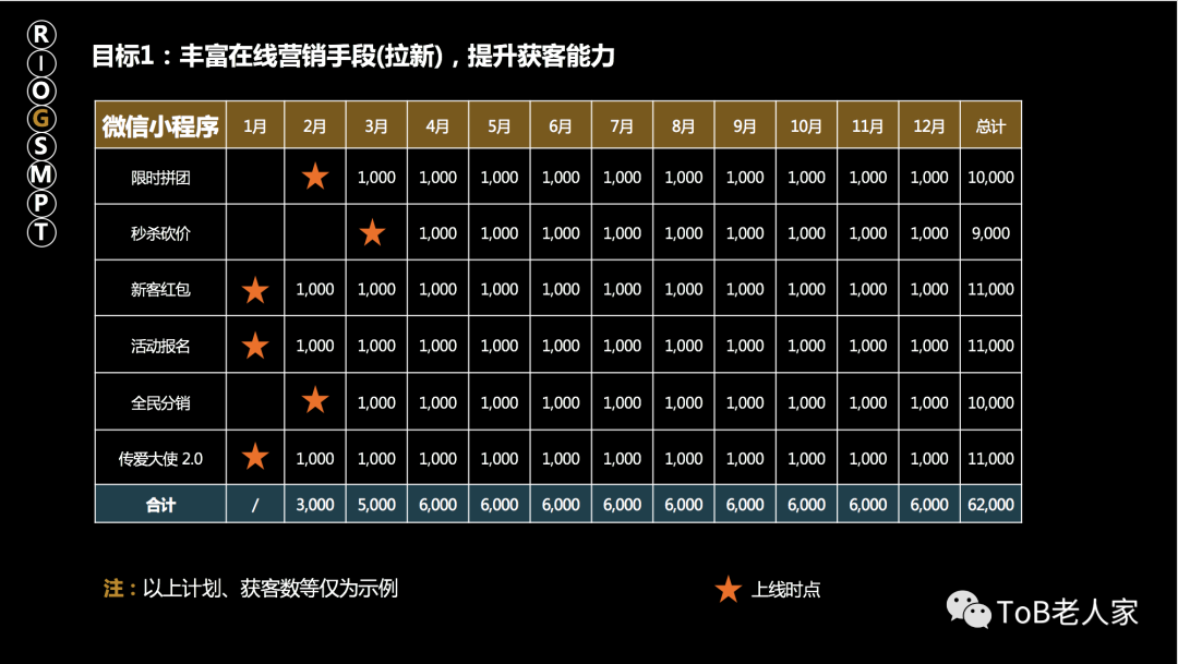 比如,如果我们设立了“提升在线化获客能力”的目标,则需要设定微信小程序的上线时间,以及每个月的新客成交数量。示例如下图: