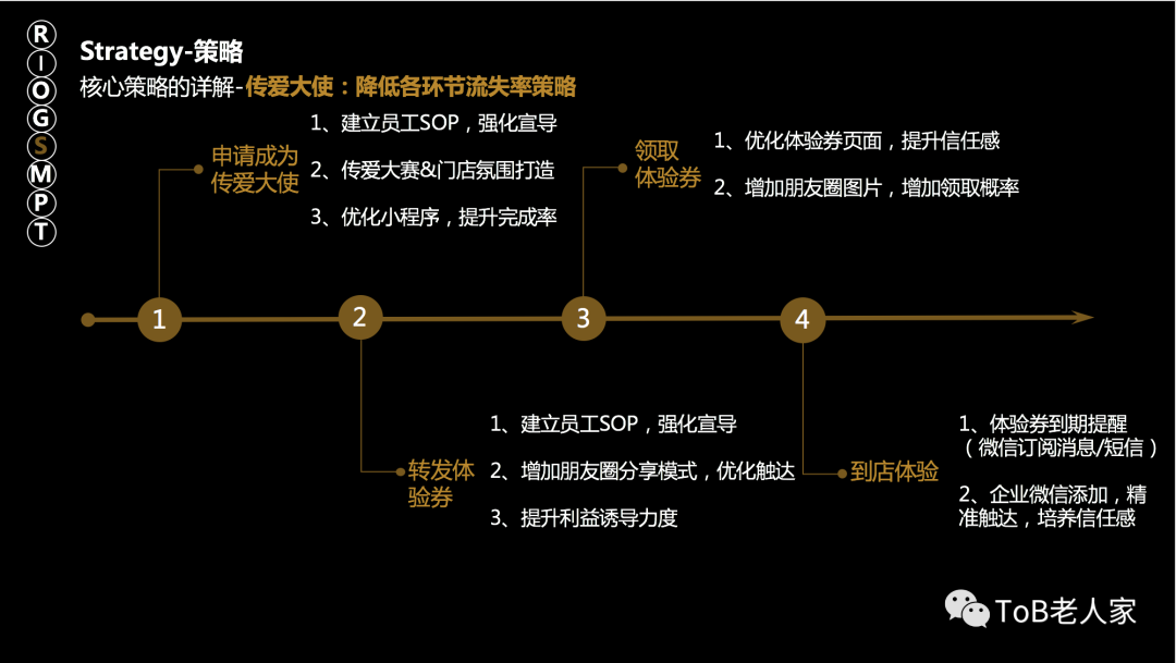 比如,通过对2020年数据的分析,发现“传爱大使”(老客转介绍小程序)各环节的留存率不到30%,因此2021年我们的策略就是通过强化SOP、简化操作等方式,提高各环节留存率,最终达到“传爱大使”获客收入翻倍的目标。详细策略示例如下图: