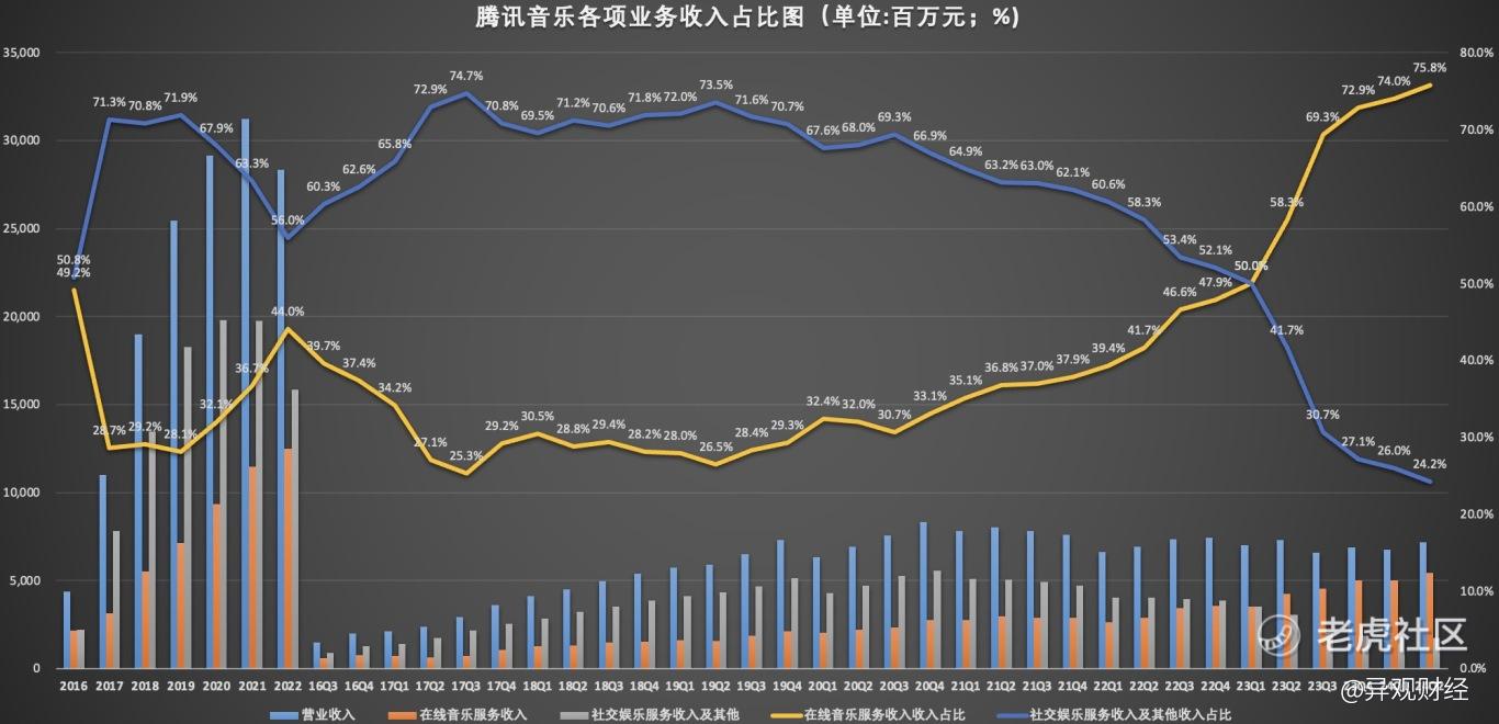 在线音乐服务、社交音乐服务和其他服务是腾讯音乐的两大主营业务,二季度二者收入在总收入中分别占比75.8%和24.2%。