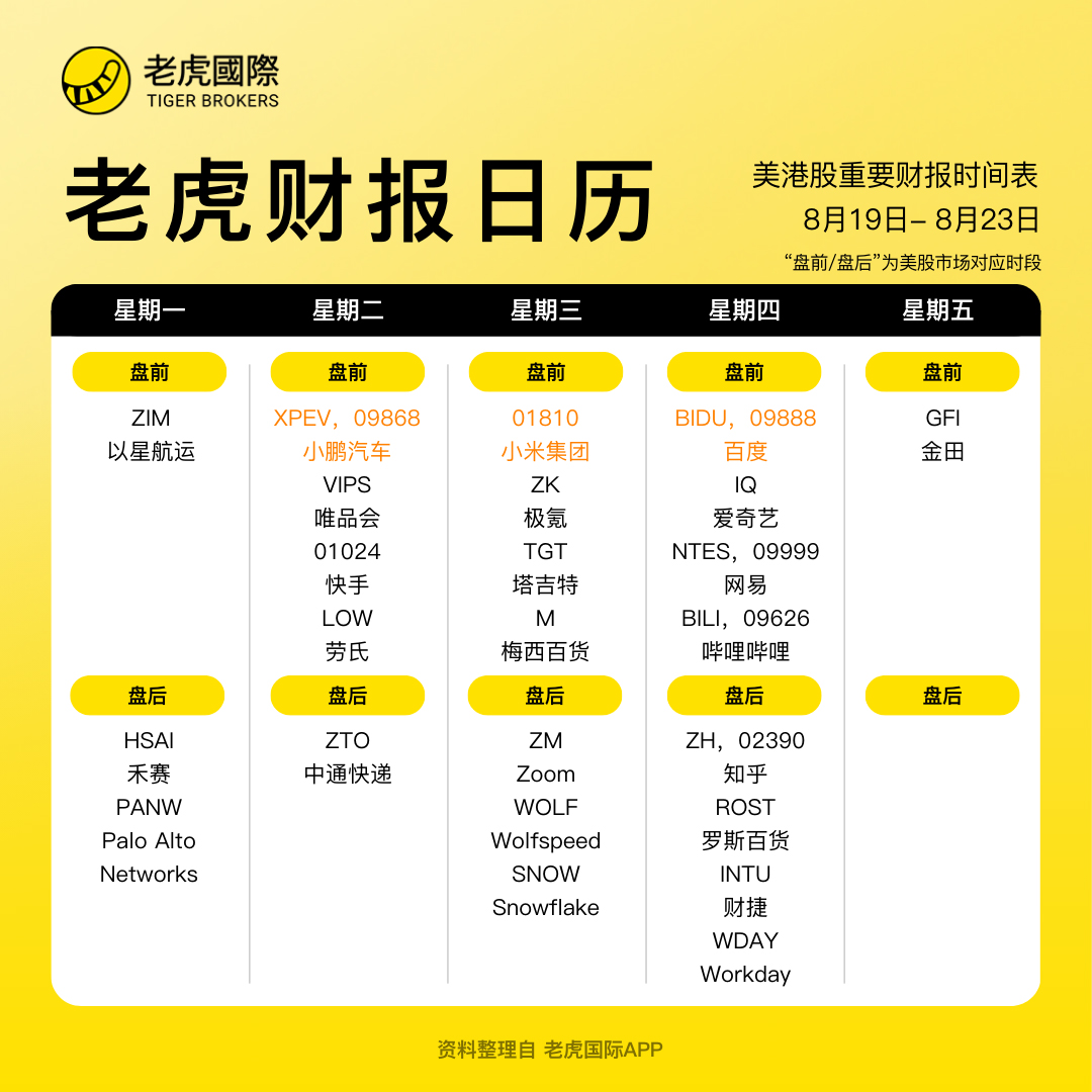 2. 下周,小鹏、小米、百度等公司将发布财报: $小鹏汽车-W(09868)$ $小米集团-W(01810)$ $百度集团-SW(09888)$ $腾讯控股(00700)$ $京东物流(02618)$