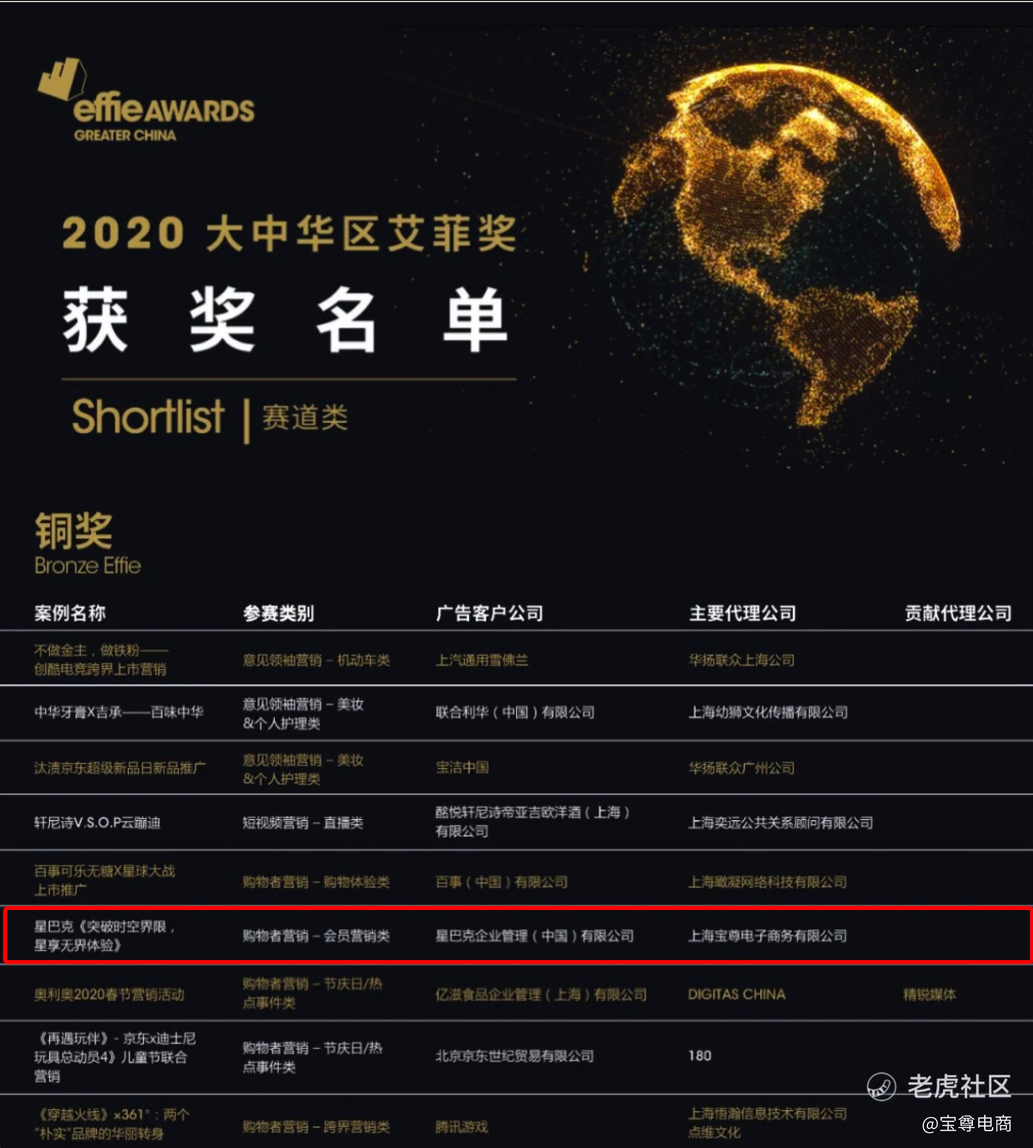 宝尊为星巴克打造的《突破时空界限,星享**体验》案例,以一场穿越时空的会员夜直播,串联起会员**体验,在2020年大中华区艾菲奖会员营销类斩获铜奖。值得注意的是,这是会员营销赛道唯一的得奖案例。