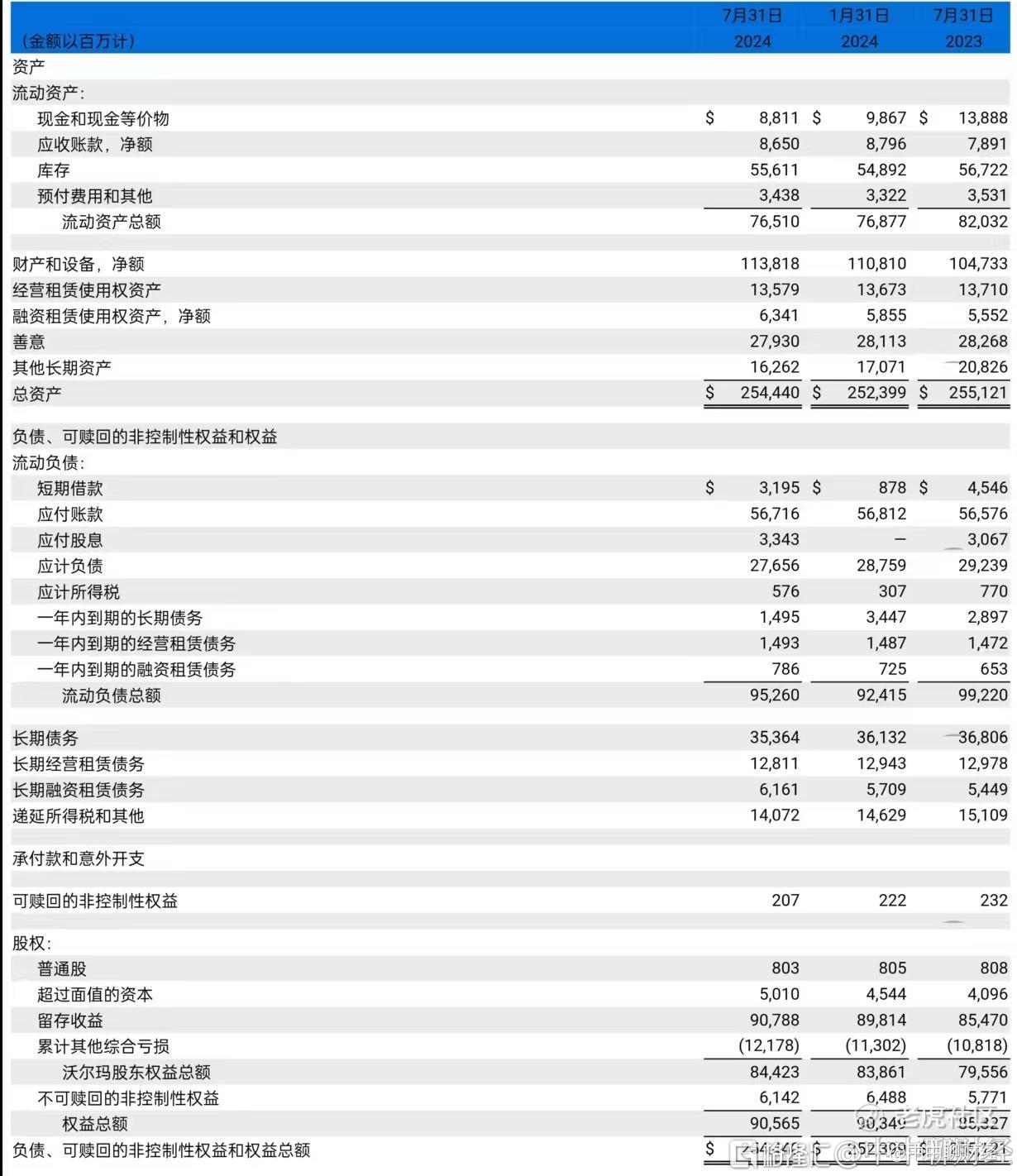 截至2024年7月31日,沃尔玛的总资产为2544.40亿美元,较上年同期的2551.21亿美元略有下降。流动资产总计为765.10亿美元,长期资产包括财产和设备净额1138.18亿美元。负债方面,流动负债为952.60亿美元,长期债务为47.53亿美元。现金及现金等价物为88.11亿美元,较上年同期的138.88亿美元有所减少。