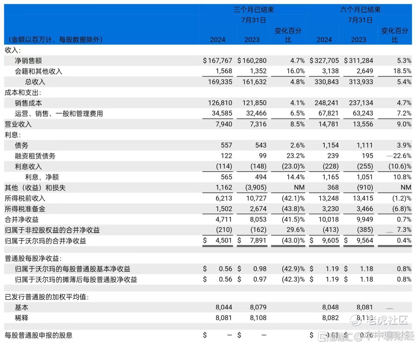 - 黑天鹅本人·2024-08-17[财迷] 沃尔玛的业绩超预期,净销售额和营业收入均实现增长点赞举报