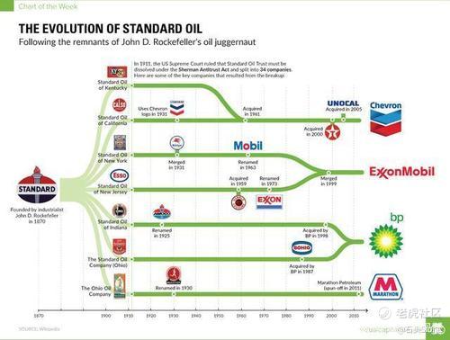 标准石油,这个可能大多数人都没听过。其实我之前也没听过,毕竟这些事情都发生在我们出生之前,我们现在都知道沙特阿美是最大的石油国,但是很少知道实际上之前的能源霸主是美国,而美国就属于不作死就不会死的国家,19世纪70年代和80年代,煤油出口占到全部美国石油的产量一般以上,90%的出口煤油都是经过“标准石油”出去的,标准石油比现在的沙特阿美不知道要风光多少,然而好景不长,1911年5月,标准石油解体,被分离出38个独立企业,可算是有史以来被分解成最多的企业了。