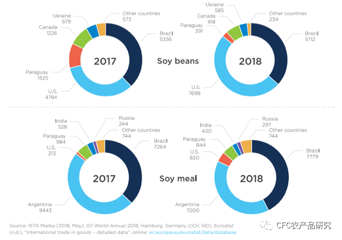 【欧盟大豆(上图)和豆粕(下图)进口来源国(千吨) 】
