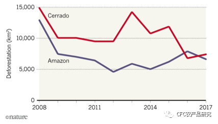 与此同时,被束缚的产能开始溢出到另一片肥沃的土地——与亚马逊雨林交接的塞拉多地区。作为南美洲第二大生物群落,和世界上生物最为多样性的热带草原,塞拉多地区成为了大豆种植的新宠。