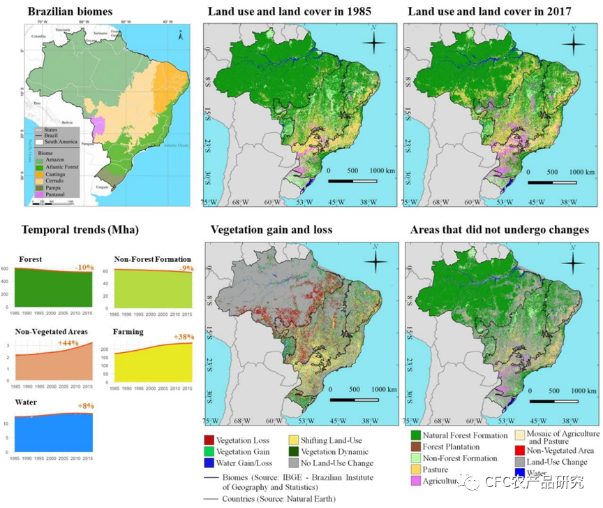 【巴西生态群系分布图(左上),1985年土地使用和覆盖(中上),2017年土地使用和覆盖(右上),土地用途趋势分析(左下),新增和减少植被分布(中下),土地用途未改变地区(右下)】