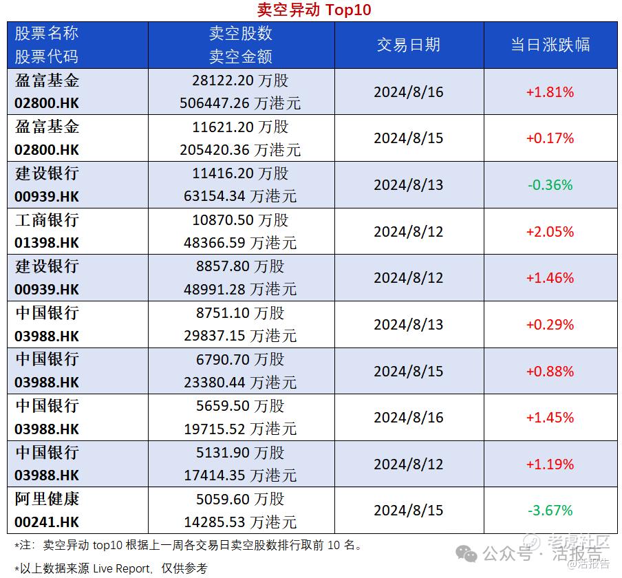 摘要:港股异动追踪周报( 2024.08.12--2024.08.18),上周摩根大通发生大量转仓,涉及市值超1.1万亿港元。本次转仓后券商持股市值排名由第4名跌至14名,持股市值已不足2千亿港元。早在1个月前摩根亦发生大量转仓,涉及资金超6千亿港元。