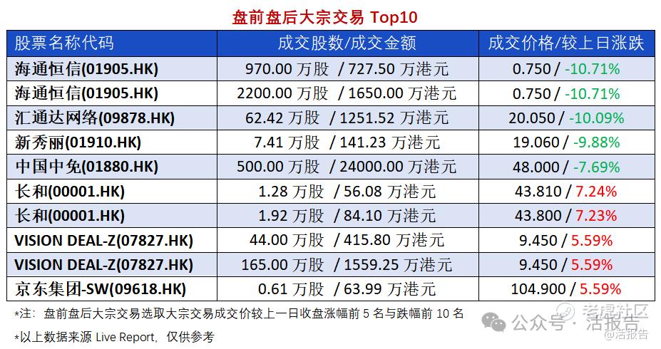 海通恒信(01905.HK)继上周发生大宗折价后本周又出现多笔大宗折价交易,8月13日盘前大宗成交1650万港币,较昨收折价10.71%,8月16日盘前大宗成交727.5万港币,较昨收折价10.71%。汇通达网络(09878.HK) 、中国中免(01880.HK)亦发生大宗交易,分别折价10.09%、7.69%。