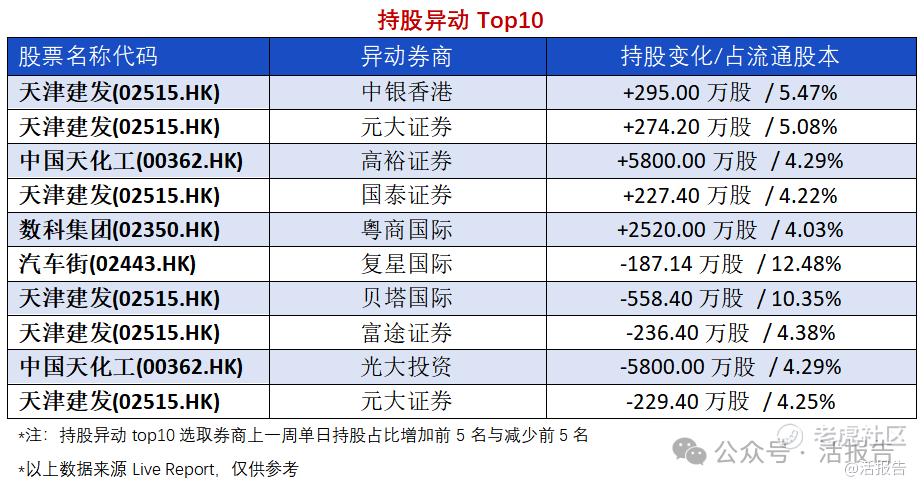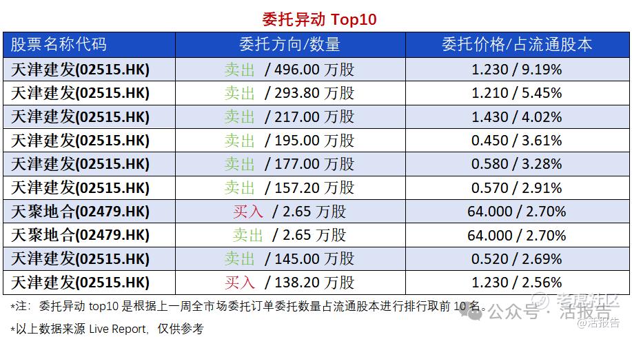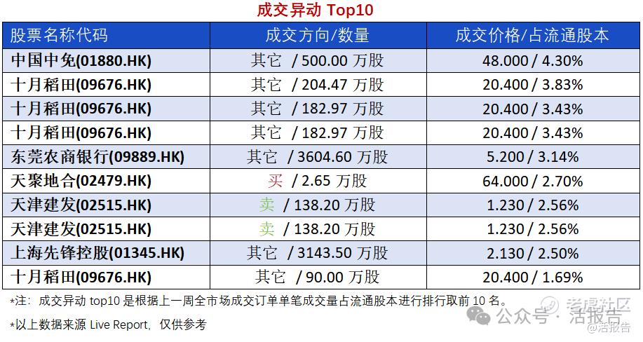 上周天津建发(02515.HK) 委托异动频繁top10榜单占据8席。十月稻田(09676.HK)成交异动频繁top10榜单占据4席。