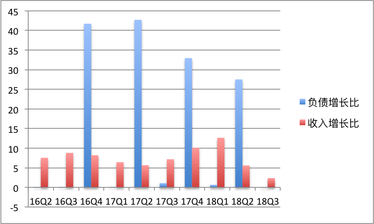 上图为奈飞从16年第二季度到18年Q3的负债及收入的环比增长比例,不难看出,其中四个季度负债增长速率是高于收入增长速率的。这就有可能导致投资者的担忧。