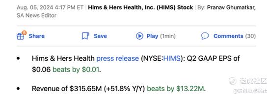 Hims报告了以下2024年第二季度的财报: