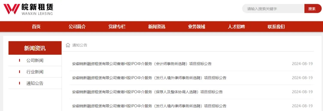8月19日,安徽皖新融资租赁有限公司(“皖新租赁“)香港H股IPO中介服务项目招标。此次招标涉及选聘的中介团队包括、保荐人及整体协调人、会计师事务所、发行人境外律师事务所、发行人境内律师事务所。