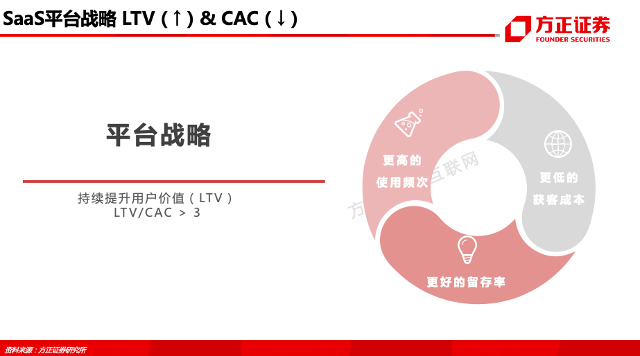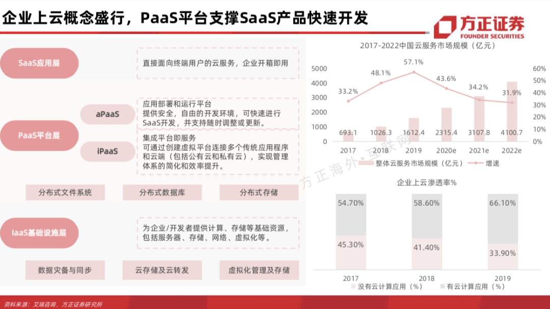 3、SaaS领域前景广阔。行业特点是增长持续强、现金流好、研发前置,关键要素在于终身价值、获客成本和客户留存比例。微盟LTV/CAC核心指标健康为6.7,有赞为1.9(需进一步降低客户流失率)。上一轮增长在于赋能中小商家,这一轮增长在于向上渗透至中大型商家。预计2022年企业上云渗透率可达80%,云服务市场达到4100亿元,SaaS市场规模突破千亿级别。