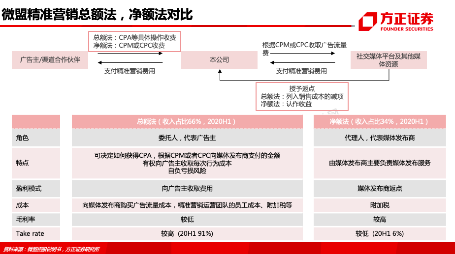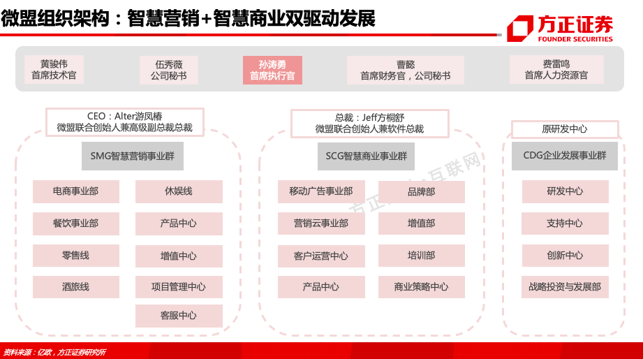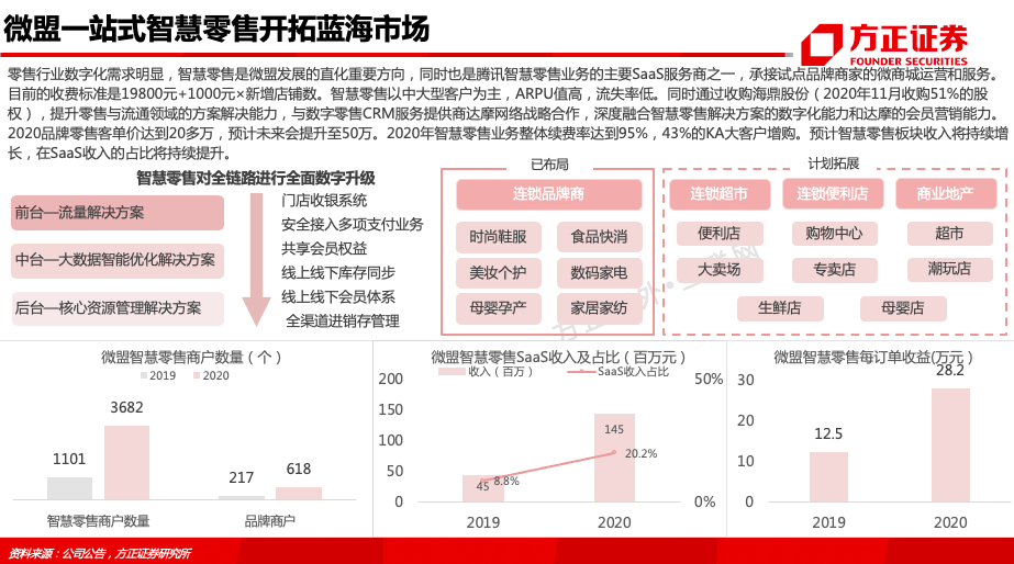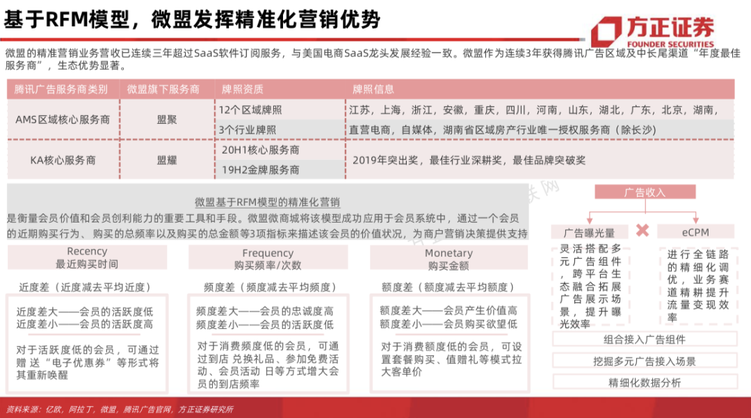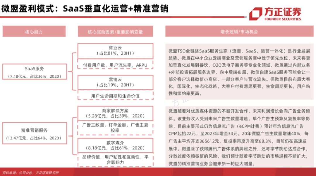 5、微盟的精准营销业务与SaaS业务产生协同效应,均处于行业龙头的地位。公司作为微信广告生态龙头代理商,享受细分行业的增长红利,通过精准营销和SaaS的交叉引流发力线下商业布局扩张智慧零售和智慧餐饮业务。微盟的精准营销侧重效果广告投放,直播及视频号的兴起丰富了广告营销的方式,广告主的预算进一步向效果广告倾斜,未来微盟将继续受益于社交平台的扩张和本地生活服务商家的营销需求的快速增长。微盟2020精准营销市占估计2.3%,预计2022年将增长至4.3%。微盟CEO孙涛勇,百度商务搜索部门出身,精通PC端建站推广和百度竞价营销,所以微盟擅长PC互联网营销,通过百度竞价和线下沙龙活动来获取客户。微盟初期主要通过微信端移动网站建站,切入市场,客户类型多为传统客户(不懂运营操作、没有流量),对运营端和服务端的需求比较重,所以微盟提供前期微商城的基础搭建还有产品设计重视微营销,诱导关注玩法,从最开始的定制建站到后面微信市场火热迅速转向模板建站抢占市场。