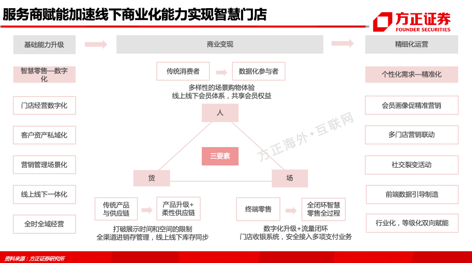 2、线下门店线上化需求迫切,零售行业正经历从“传统零售”升级成为“智慧零售”的变革,预计2022年线上渗透率达到36%。智慧零售的本质是数字化、稳增长、促创新,推动新旧动能转换。微盟和有赞主要从三个方向帮助企业完成传统零售到智慧零售的转型:①帮助企业线上线下一体化全域全时经营;②汇集企业流量,升级流量闭环运营;③搭建企业数字资产。