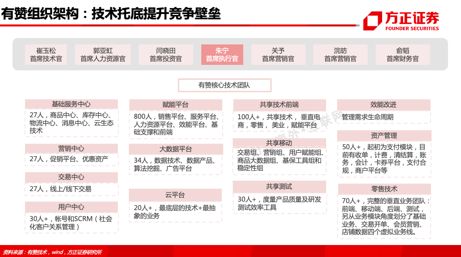 6、有赞获得支付牌照可打造“交易+支付+金融”的基础设施建设,完善闭环有望从服务工具发展到完整电商生态构建竞争壁垒,实现多种类增值服务变现。业务重点则进一步聚焦在SaaS的垂直化业务上,中国有赞的私有化和有赞科技的计划主板上市将剥离上市公司的电子支付业务,此举可使公司进一步聚焦SaaS概念提升公司估值,并且隔离电子支付业务的风险。有赞CEO白鸦(原名朱宁),产品设计出身,2008年加盟支付宝担任首席产品设计师,注重交互和产品使用体验,重视客户的反馈,所以有赞在市面上以优秀的产品设计、出色的用户体验和流畅的打开速度闻名。有赞在拥有一批优质客户的基础上(有赞的第一批客户来自于阿里系——具备流量基础和运营基础),收到了有效的反馈,做好产品开发同时拥有了不少成功的客户案例,塑造了客户标杆和市场声量,稳扎稳打一步步占领市场。
