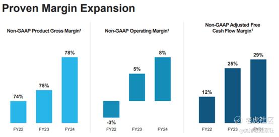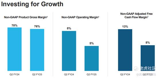 如图所示,与2022财年相比,2024财年的产品毛利率从74%扩大到78%。同期,营业利润率从-3%上升至正8%,自由现金流利润率从2022年的12%上升至2024财年的29%。然而,这一切都已成为过去。看看本季度与去年同期的利润率。