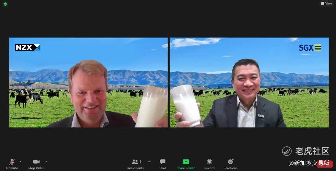 新西兰证交所首席执行官Mark Peterson(左)和新交所首席执行官罗文才(右)通过Zoom平台对亚洲及以外地区乳制品衍生品的未来发展举杯庆贺