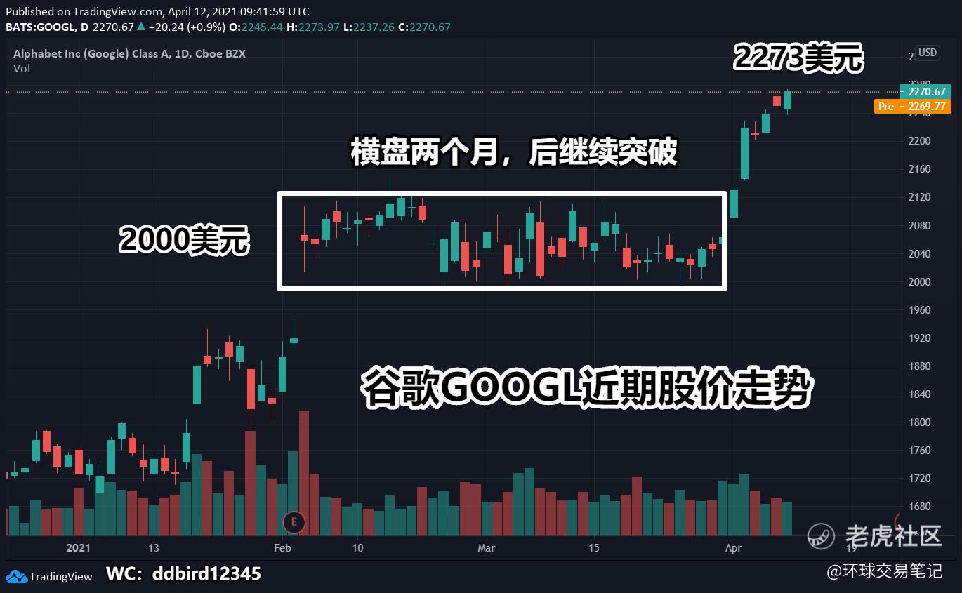 二月份,科技股普遍下跌,谷歌走势也维持坚挺,只是横盘调整,维持在2000美元附近震荡。一直到进入今年4月份,股价重新突破前高来到2273美元。