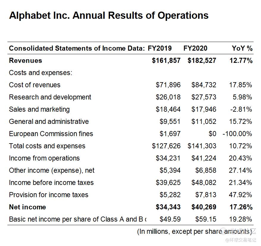 图:谷歌2019-2020年利润表数据对比,来源:谷歌2020年年报