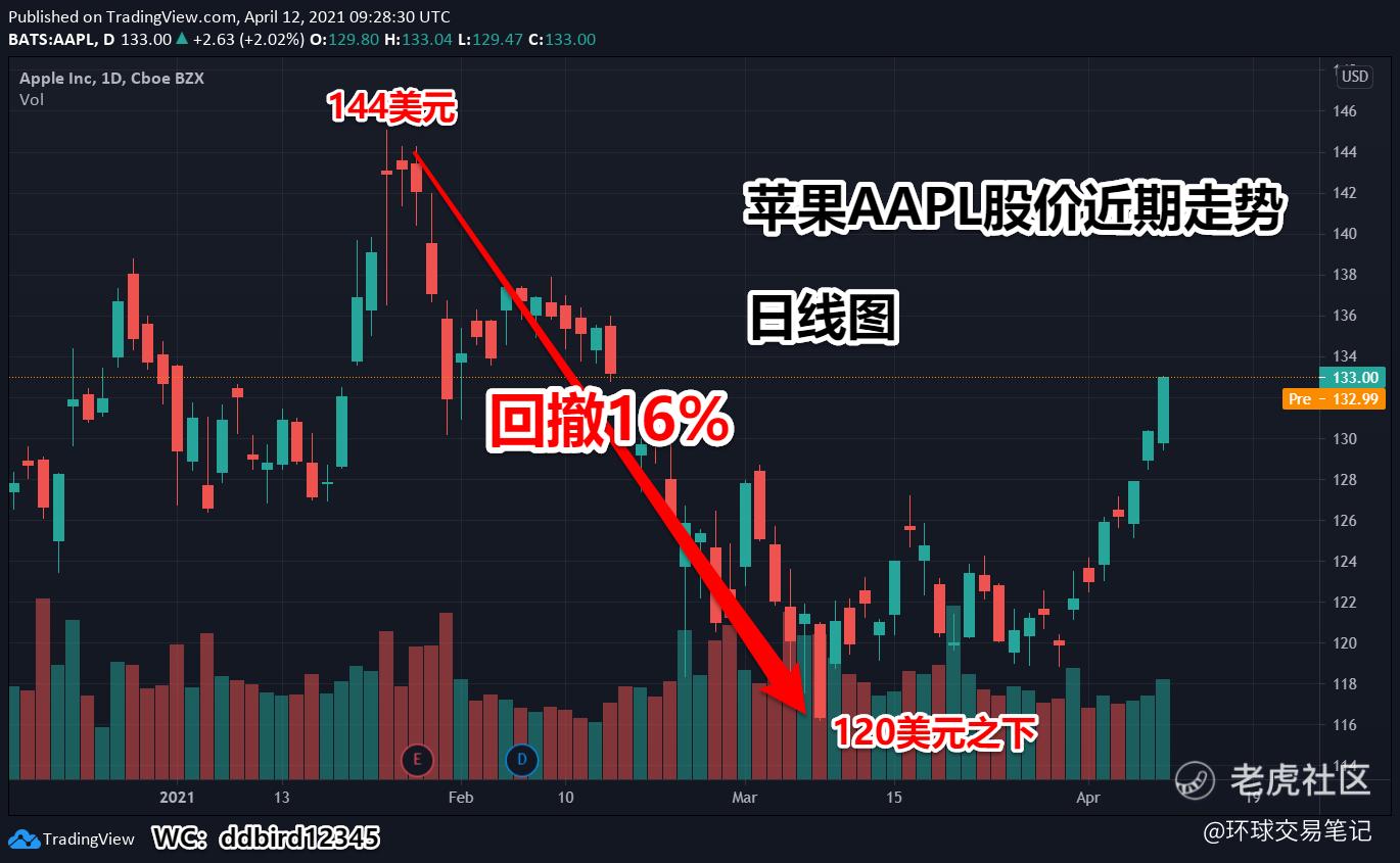其后,虽然苹果股价继续拉升至144美元附近,但是好景不长,很快被打回原形。股价从144一路回撤至120之下,回撤幅度在16%左右。
