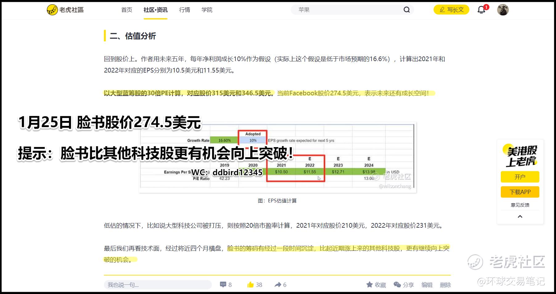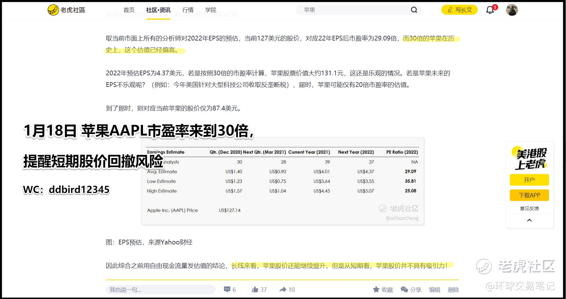 图:1月18日《环球交易笔记》老虎发文截图