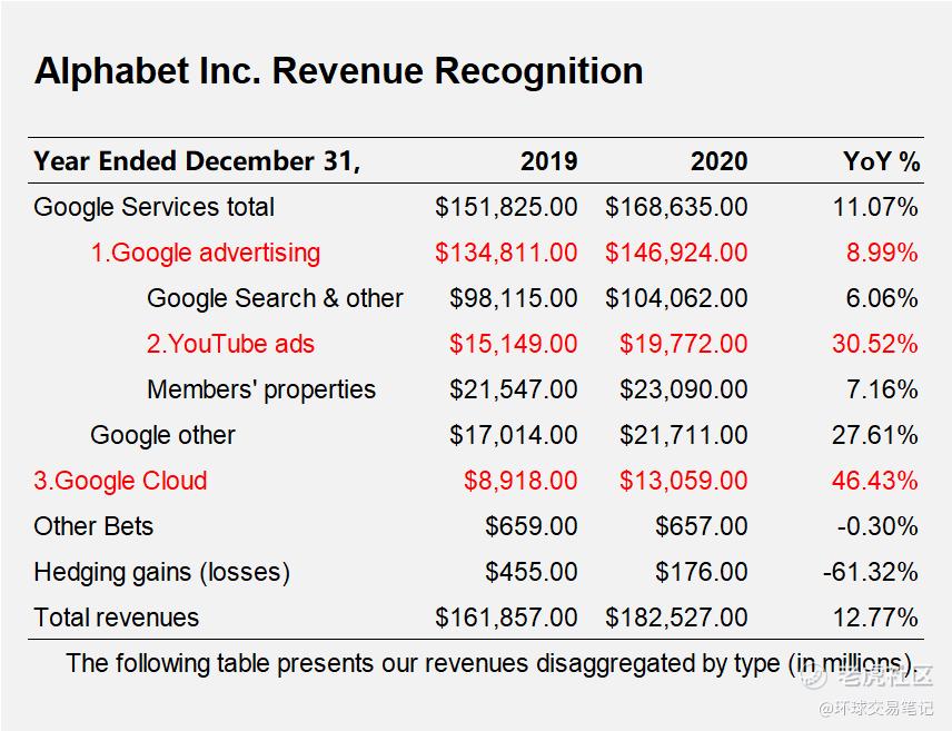 - 云计算业务。这次也是Alphabet首次披露谷歌云业务的运营结果。该块业务全年营收增幅46%,增长快速。