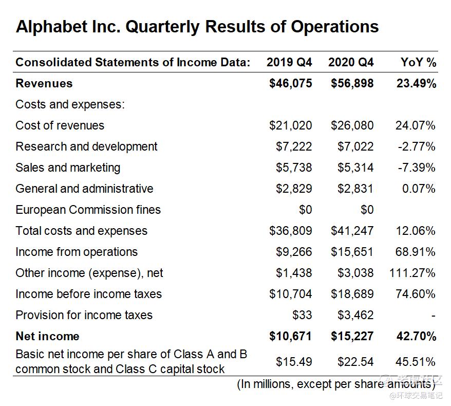 图:谷歌2019-2020年Q4利润表数据对比,来源:谷歌2020年年报