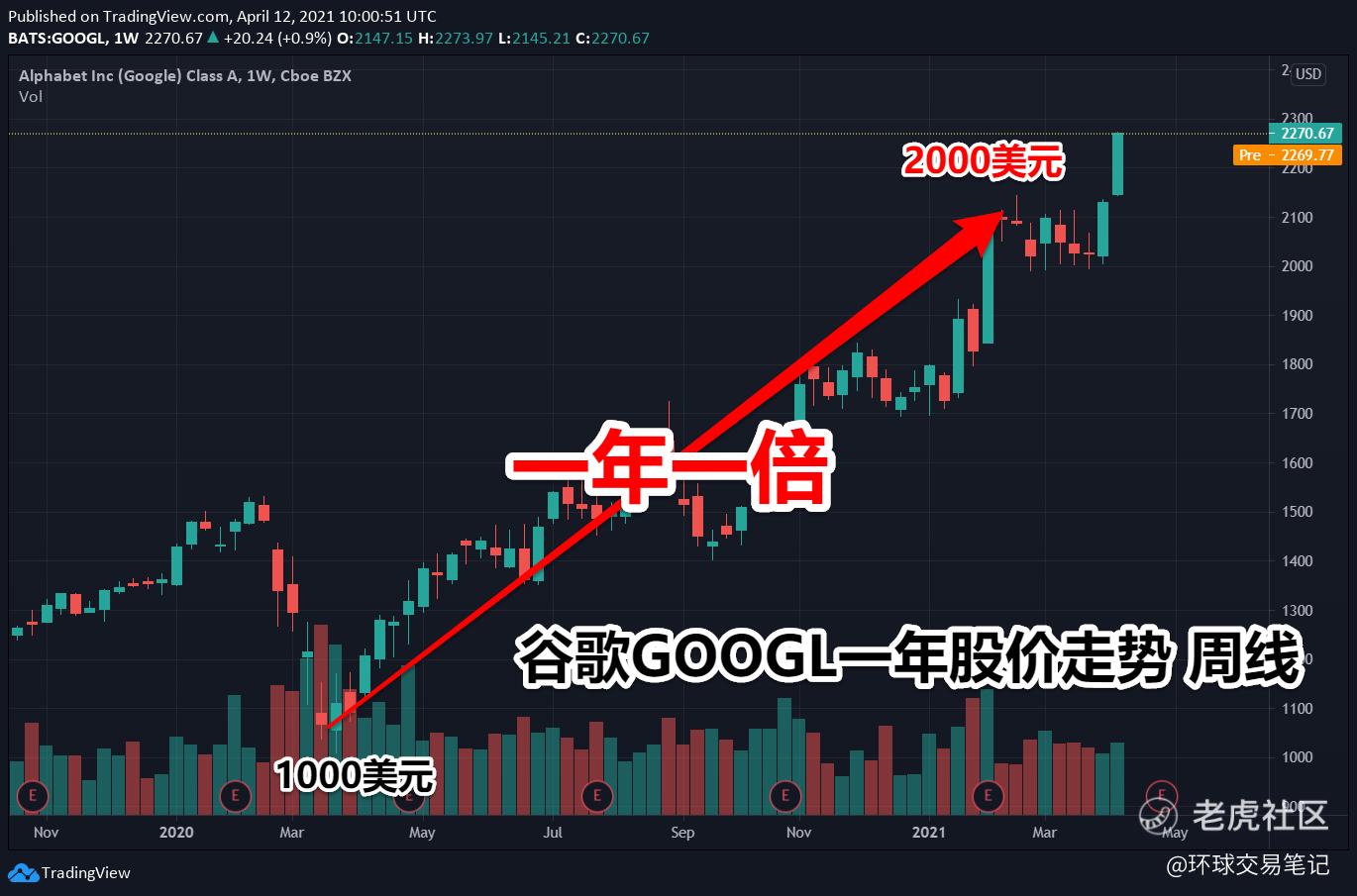 去年是美股科技股的大牛市,身为其中一员的谷歌股价表现亦是可圈可点。在2020年三月份股价受到疫情影响,谷歌曾一度来到1000美元附近,其后随着谷歌公布大杀器Youtube收入数据,到21年二月份,股价就已经涨到2000美元了,一年的时间股价翻了一倍。