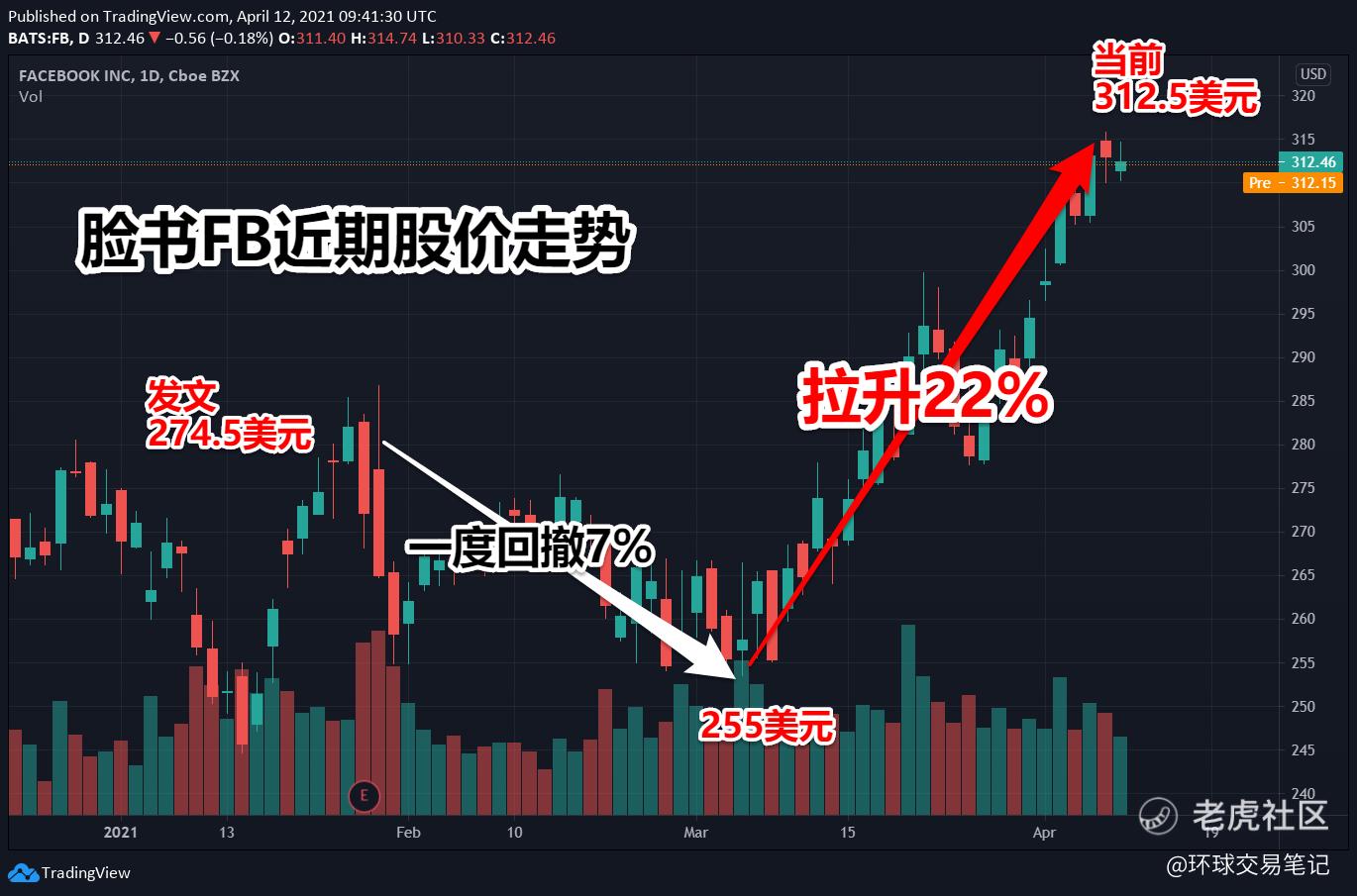 发文后虽然脸书股价一度回撤7%,但是进入三月份,脸书股价开始拉升。现在,脸书股价已经从当时274.5美元上涨到上周收盘的312.5美元,非常接近我们的目标价了。
