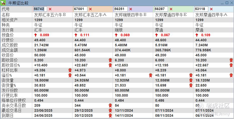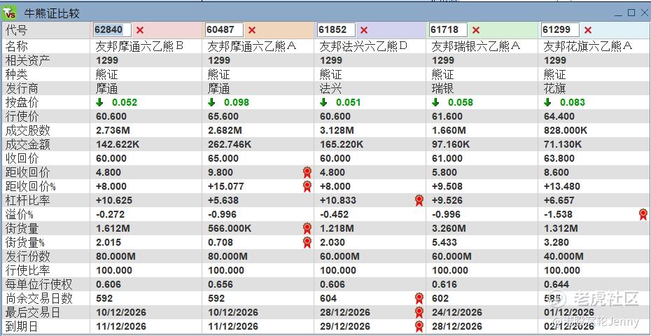 有看好的投资者认为,友邦中线上望60元。市场上亦有投资者会利用熊证捕捉看淡交易机会,因为熊证杠杆往往比认沽证高,不过,投资者要留意,熊证有收回机制,所以对于收回价的考虑应比较保守。相对稍远的熊证产品有 $友邦瑞银六乙熊A.P(61718)$ ,收回价61元,杠杆9倍,2028年12月份到期,条款相近的产品有2只。